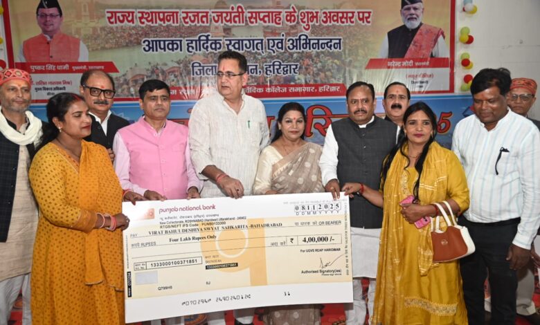 उत्तराखंड राज्य के स्थापना रजत जयंती सप्ताह के अंतर्गत आयोजित कार्यक्रमों में आज ऋषिकुल आयुर्वेदिक महाविधालय ऑडोटोरियम में जिला प्रशासन की ओर से जनपद के राज्य आंदोलनकारियों के लिए सम्मान समारोह आयोजित किया गया,जिसमें मुख्य अतिथि राज्य सभा सासंद कल्पना सैनी एवं अन्य जनप्रतिनिधियों द्वारा दीप प्रज्वलित कर कार्यक्रम का शुभारंभ किया।इस अवसर पर राज्य आंदोलनकारियों को पुष्प माला एवं शॉल भेंटकर सम्मानित किया।