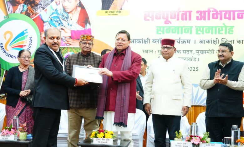 मुख्यमंत्री पुष्कर सिंह धामी के निर्देशन एवं जिलाधिकारी मयूर दीक्षित के नेतृत्व में जनपद में चलाये गये संपूर्णता अभियान कार्यक्रम के लिए जनपद को सम्मानित किया गया । आज देहरादून में नीति आयोग द्वारा राज्य स्तरीय संपूर्णता अभियान सम्मान समारोह मुख्य सेवक सदन/मुख्यमंत्री कार्यालय, देहरादून में आयोजित किया गया जिसमें मुख्यमंत्री पुष्कर सिंह धामी द्वारा सम्मान समारोह के दौरान हरिद्वार जनपद द्वारा आकांक्षी जनपद कार्यक्रम के अंतर्गत संपूर्णता अभियान कार्यक्रम मे किये गये उत्कृष्ट कार्य के लिए मुख्य विकास अधिकारी डा0 ललित नारायण मिश्र को सम्मानित किया गया । मुख्यमंत्री द्वारा मुख्य विकास अधिकारी को मेडल एवं प्रशस्ति पत्र देकर सम्मानित किया गया । जनपद हरिद्वार द्वारा नीति आयोग के कार्यक्रमों में किये जा रहे उत्कृष्ट कार्यों के लिए मुख्यमंत्री द्वारा जिले की टीम की प्रशंसा की गई । मुख्यमंत्री द्वारा नीति आयोग के कार्यों से जुड़े विभिन्न विभागों के अधिकारियों को भी शील्ड प्रदान कर सम्मानित किया गया है । जिला विकास अधिकारी वेद प्रकाश, मुख्य चिकित्साधिकारी आर0 के0 सिंह, अर्थ एवं संख्याधिकारी नलिनी ध्यानी, जिला कार्यक्रम अधिकारी धर्मवीर यादव, अपर जिला सांख्यकीय अधिकारी सुभाष सिंह शाक्य, खंड विकास अधिकारी बहादराबाद मानस मित्तल, चिकित्साधिकारी डा0 कोमल, खंड शिक्षा अधिकारी विनोद कुमार, निम्मी राणा, अवतारी सती, राजकुमार, जयवीर कौशल आदि को भी सम्मानित किया गया ।