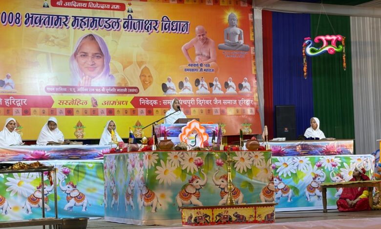 हरिद्वार। श्री प्रेमनगर आश्रम में निर्मित भव्य पाण्डाल में आयोजित 1008 भक्तामर महामण्डल बीजाक्षर विधान (विश्व शांति महायज्ञ) का आज तीसरा दिन श्रद्धा और भक्ति के साथ सम्पन्न हुआ। यह आयोजन पूज्य सन्त शिरोमणि आचार्य 108 विद्यासागर जी महाराज की शिष्या पूज्य आर्यिका 105 पूर्णमति माता जी के सानिध्य में चल रहा है।